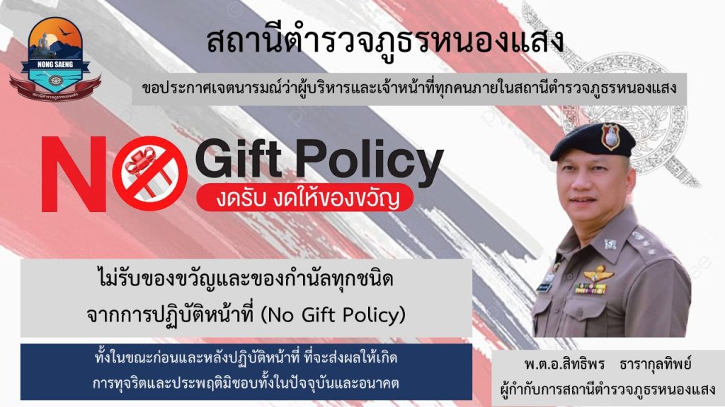 Previous Next ประกาศนโยบาย No Gift Policy จากการปฏิบัติหน้าที่ พ.ต.อ.สิทธิพร ธารากุลทิพย์ ผกก.
